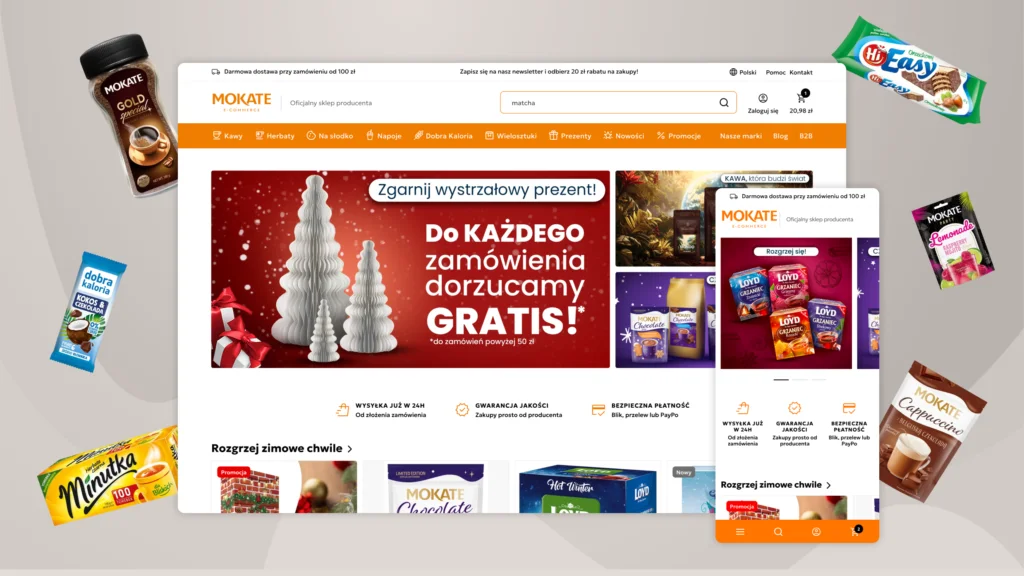 Dla lidera branży spożywczej, marki Mokate, zrealizowaliśmy kompleksowe wdrożenie nowej platformy sprzedażowej opartej o silnik PrestaShop. Wykorzystując nasze autorskie rozwiązanie Sellbox, stworzyliśmy sklep z dedykowaną szatą graficzną, implementując jednocześnie zaawansowane narzędzia wsparcia sprzedaży (cross-selling, zestawy produktowe).